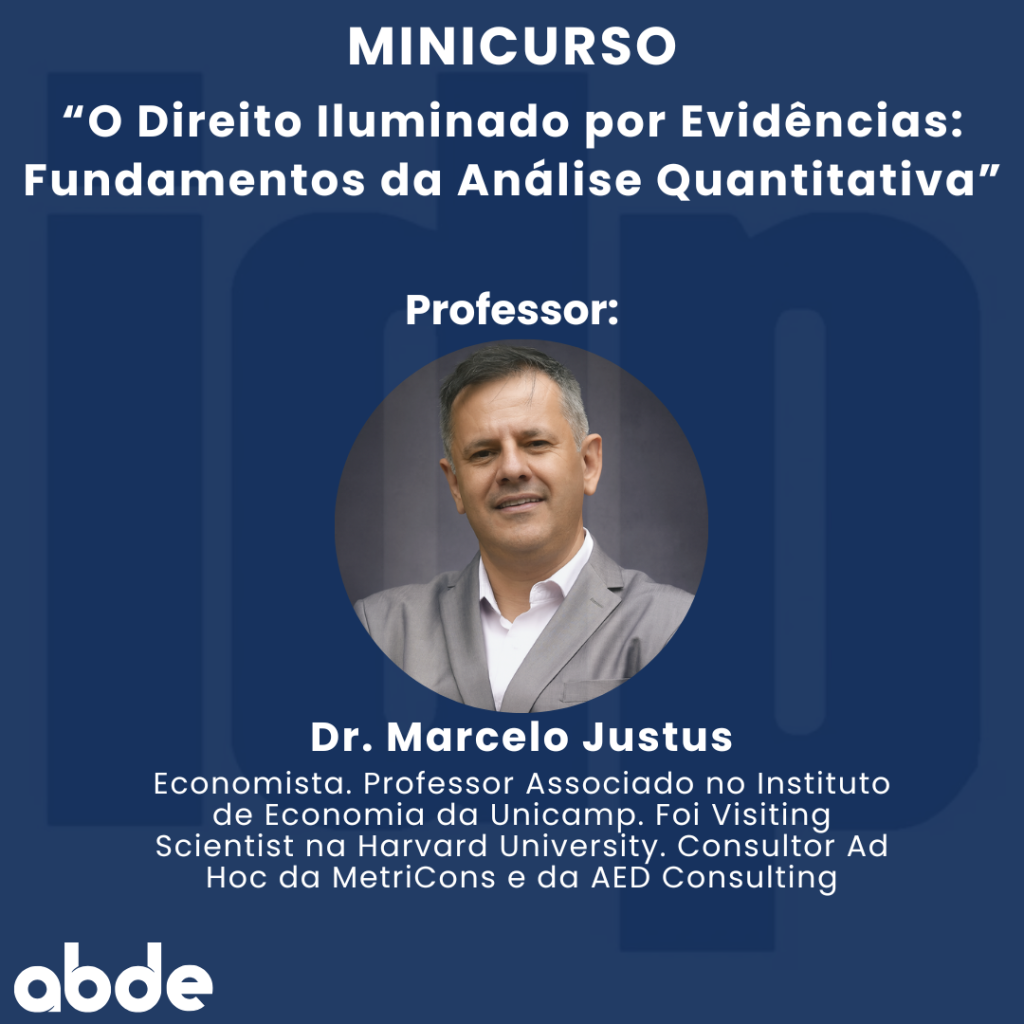 No dia 29/10/2025, das 17:00 às 20:00, no IDP – Instituto Brasileiro de Ensino, Desenvolvimento e Pesquisa (Asa Norte) -, a ABDE promoverá o Minicurso “O Direito Iluminado por Evidências: Fundamentos da Análise Quantitativa” para os associados da ABDE, um dia antes do XVIII Congresso Anual da Associação.